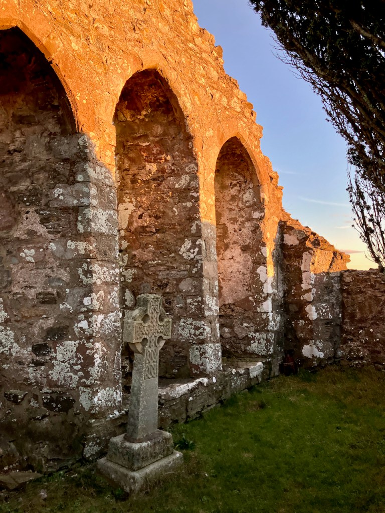 We spent half an hour or so wandering around the chapel’s burial ground as the sun sank steadily toward the fields. An old yew tree and holly tree take up much of the chapel’s roofless interior, and its stone arches catching the low winter sun in the stillness of the late afternoon created that eerie sense of time’s suspension. We found no treasure, but there are the gravestones of local fisherman lost at sea and a memorial commemorating a crew of lifeboatmen who drowned in the February of 1874. The sun finally dipped out of view and we made our way back along the cliffs, the old fisherman’s cottages at Cowie shrouded in deepening shadow and the waves just audible amongst the rocks below.